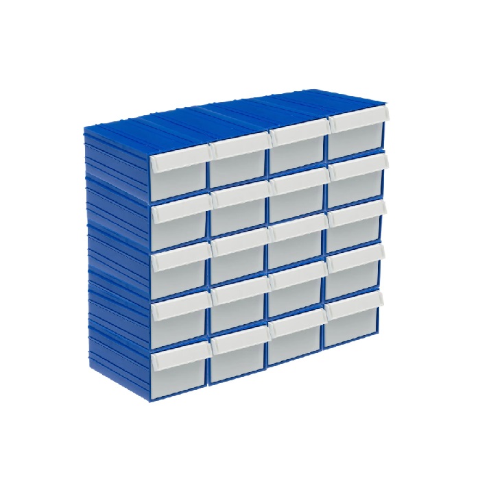 Комплект пластиковых коробов С-2 (20 шт.) — незаменимый помощник для организации эффективного и компактного места хранения для дома, офиса, гаража, мастерсокой или складского помещения. Комплект из 20-ти пластиковых коробов С-2 синего цвета с прозрачным выдвижным контейнером подойдет для абсолютно любых мелочей: