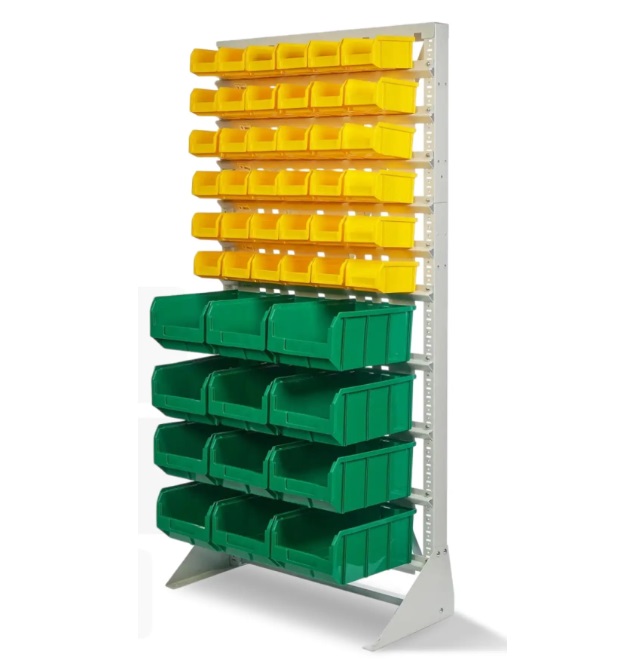 Стойка 735х1500 Стелла-техник A1-06-00-04 односторонняя служит для эффективной организации рабочего пространства склада, магазина, гаража, мастерской. Используется для систематизации и хранения мелких подручных приспособлений и инструментов. Опоры стойки 735х1500 имеют возможность крепления к полу, что обеспечивает высокую устойчивость всей конструкции. Стойка оснащена ящиками различной вместимости, в количестве 48 штук, в каждом из которых предусмотрен специальный кармашек для опознавательной карточки — это позволяет эффективно систематизировать помещенные туда инструменты и приспособления. Сборка данной конструкции не требует от пользователя каких-либо специальных знаний и умений. Стойка не займет много места в авто-слесарной мастерской, на складе или в торговом помещении. Комплектация: Стойка под пластиковые ящики 735х1500мм; Опора стойки односторонняя комплект (правая + левая + крепеж); Держатель для стойки 735мм., серый, распределенная нагрузка до 40кг. на ряд — 10 шт.; Пластиковый ящик серии V-1, размер 172х102х75мм. — 36 шт.; Пластиковый ящик серии V-3, размер 341х207х143мм. — 12 шт. Упаковка. Преимущества: Хороший визуальный обзор содержимого. Каждый ящик оснащен специальным кармашком, позволяющим вставить этикетку для индикации содержимого. Конструкция стойки позволяет легко извлекать нужный ящик и так же легко устанавливать его на место. Быстрая сборка. Высокая прочность.
