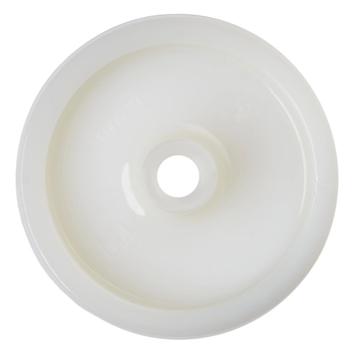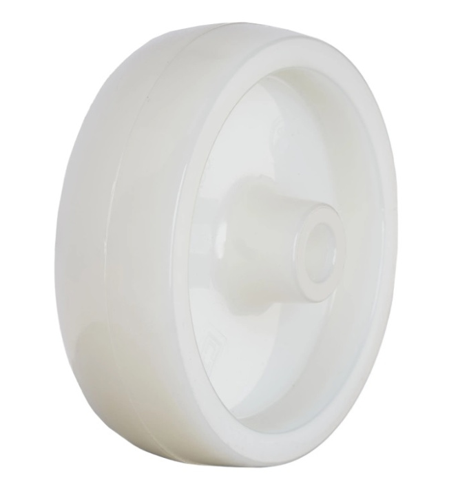 Колесо промышленное диаметром 100 мм и грузоподъемностью до 300 кг - отличный выбор для тележек, идеально подходит для использования в различных отраслях. Колесо для тележки с диаметром оси 12 мм изготовлено из прочного полиамида белого цвета. В ступице колесо оснащено подшипником скольжения (втулка в комплект не входит).