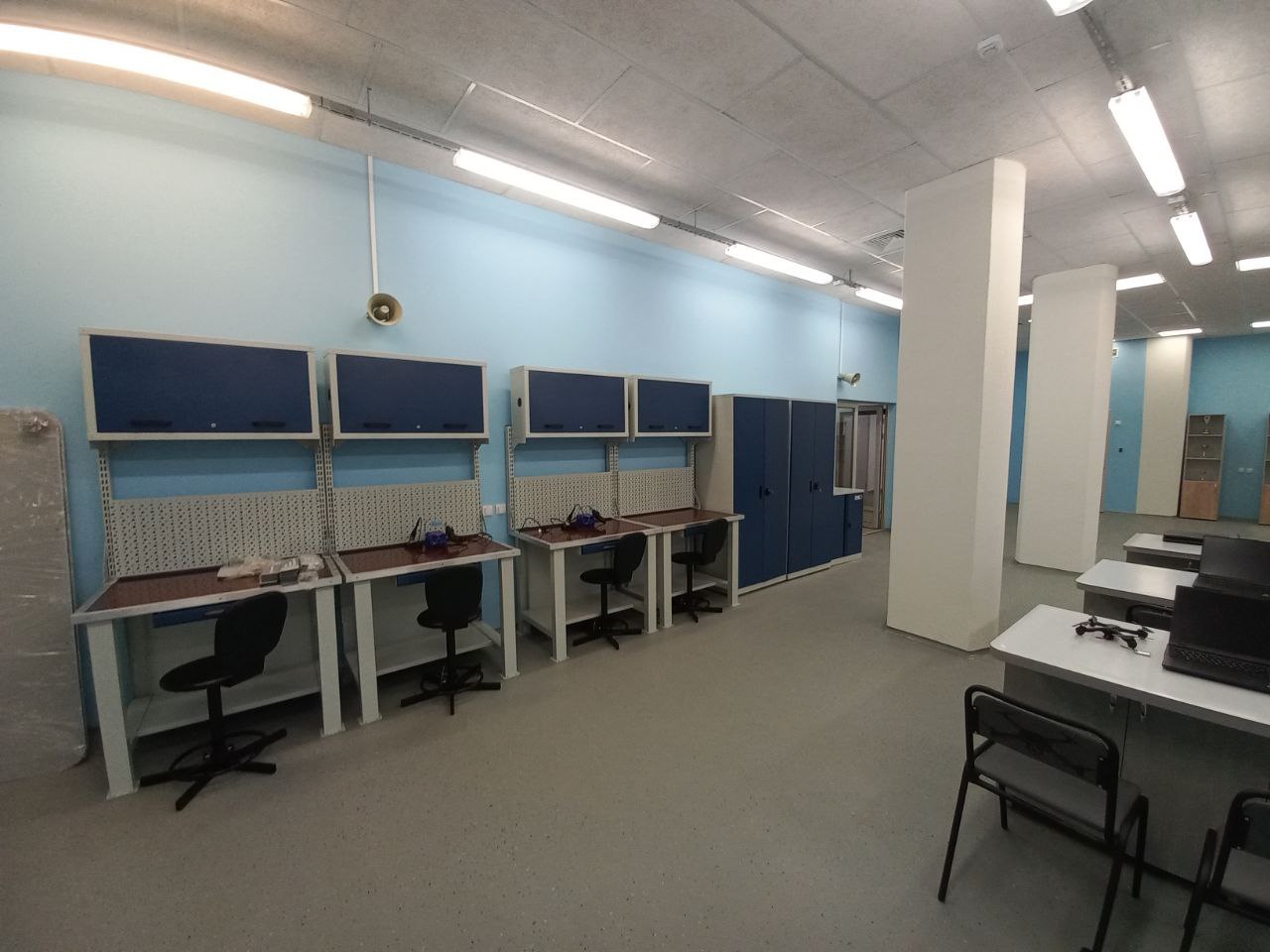 Особое внимание при оснащении было уделено эргономике и долговечности — например, стулья сварщика «Ампер С-4» установлены в зонах практических занятий по технике безопасности и обработке металлов, что позволяет учащимся работать в условиях, максимально приближенных к реальному производству. Профессиональные тумбы и шкафы, такие как инструментальный шкаф MODUL XXL 02 с раздвижными дверями, добавляют удобства при хранении оборудования, а закрытая тележка CAR-TOOL TV-1 помогает перемещать инструменты между лабораториями. В отдельных технических классах использованы шкафы ERGO 181/2 и гардеробные шкафы COMFORT 2000/22.2, обеспечивающие порядок и безопасность в помещениях для учеников.